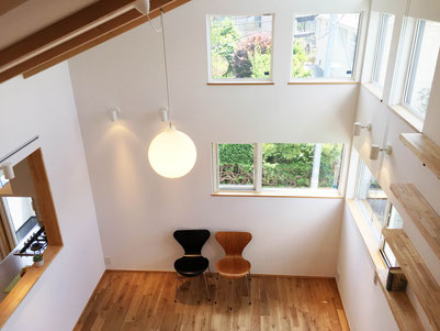 階段をトントンと上がると、高~い吹き抜けがご自慢のリビングダイニング。