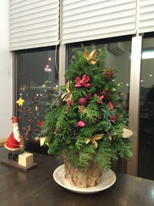 本物のモミの木でできたクリスマスツリーのアレンジメントです。