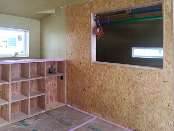 対面キッチンのリビング側はOSB合板で仕上げました