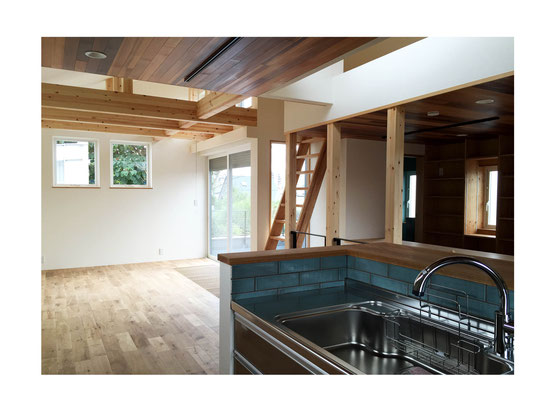 キッチンの天井は木目が美しいウエスタンレッドシダーの羽目板を採用。