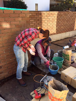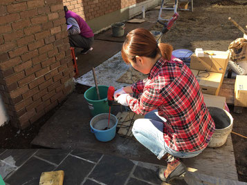 お忙しいお仕事の合間に、丁寧に目地の埋め方を教えて