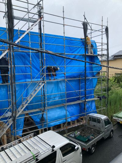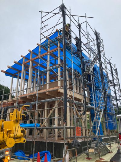不安定なお天気での上棟となり、大工さん・鳶さん・現場監督は材料を濡らさないよう