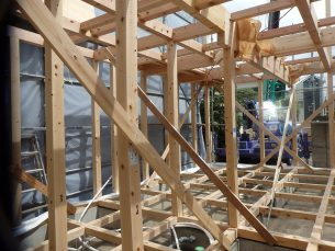 敷地が旗竿の土地なので、表からの搬入が難しく、
