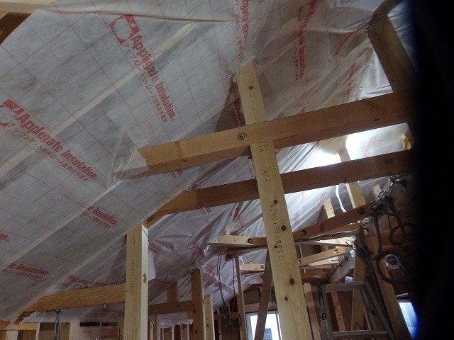 屋根部分は内側にシートを貼り、セルロースを吹き込む施工になります。