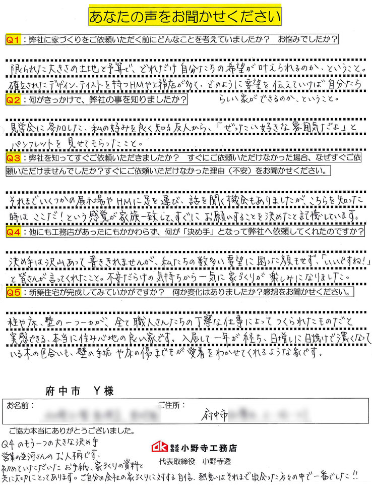 ご新築完成時にお客様から頂戴したアンケートの一部をご紹介致します。
