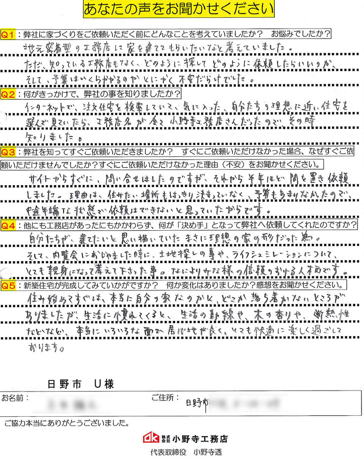 ご新築完成時にお客様から頂戴したアンケートの一部をご紹介致します。