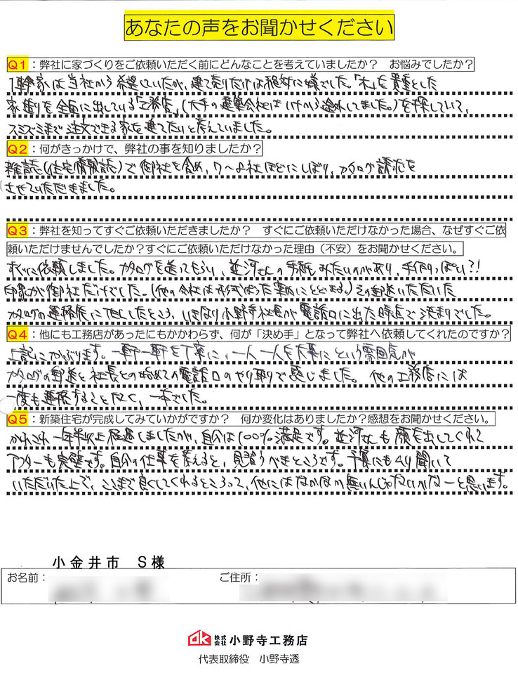 ご新築完成時にお客様から頂戴したアンケートの一部をご紹介致します。