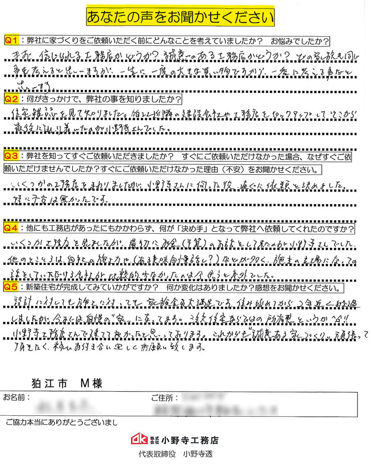 ご新築完成時にお客様から頂戴したアンケートの一部をご紹介致します。