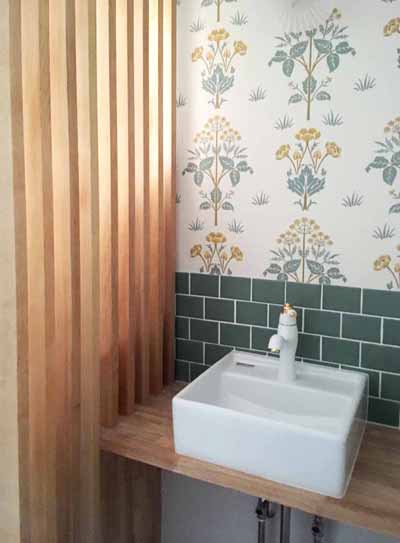 素敵なボタニカル柄の輸入クロスに名古屋モザイクのタイルで色を揃えました。