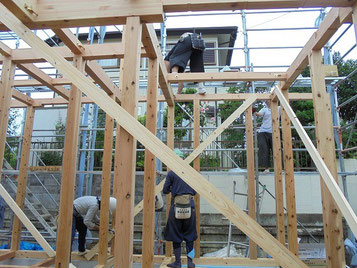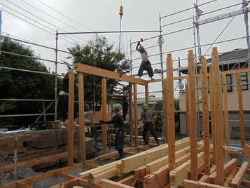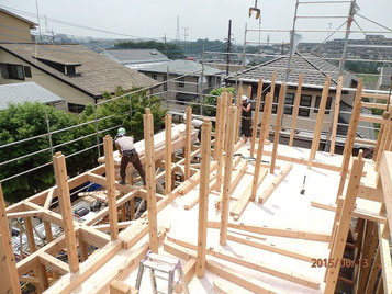1階部分を立ち上げた段階で、柱のねじれ等をチェックして