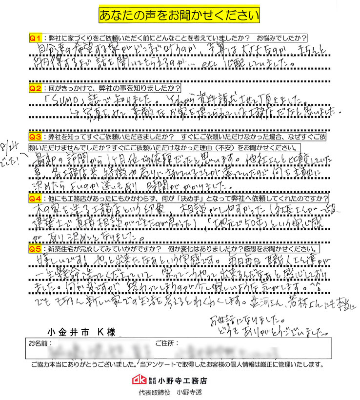 ご新築完成時にお客様から頂戴したアンケートの一部をご紹介致します。