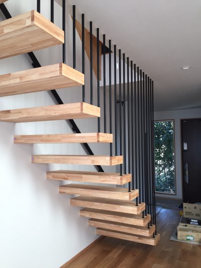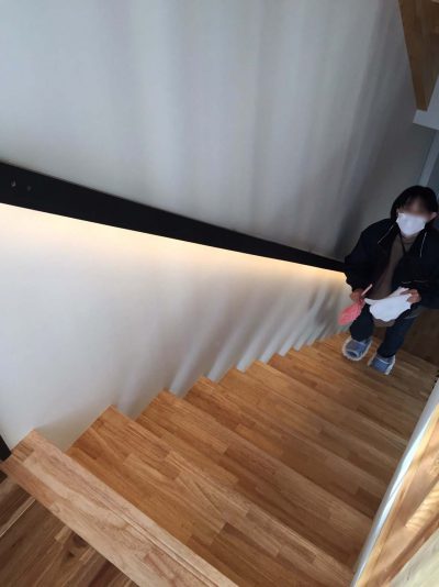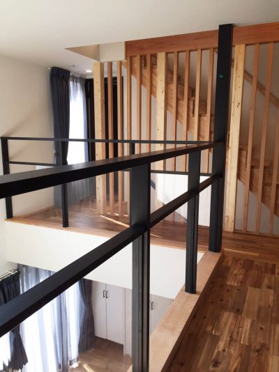 吹抜けの角手すりや間接照明の入った壁手すりは