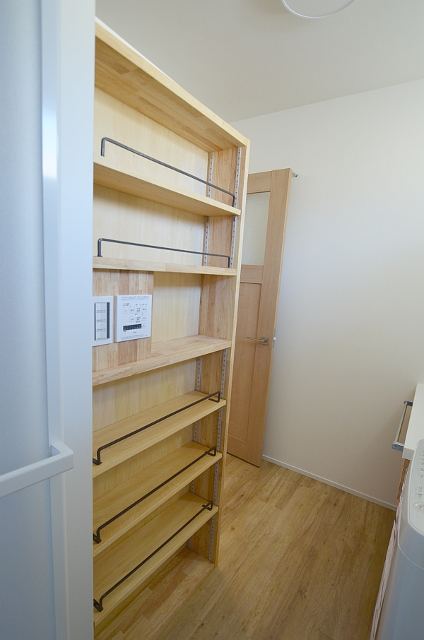 パントリーと洗面室は壁の向こうでつながっています。いわゆる回遊動線です。