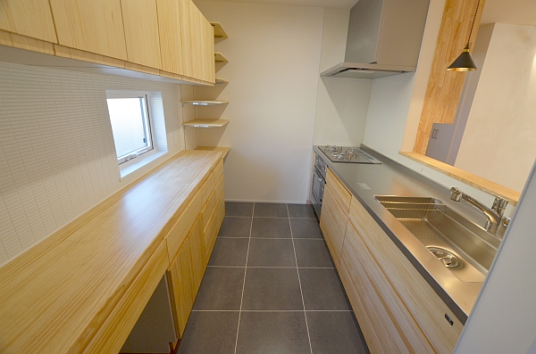 システムキッチンは、ウッドワンという会社の製品を使っています。床は掃除などメンテナンスの楽な樹脂タイル、背面カウンターの壁には名古屋モザイクのタイルを貼っています。