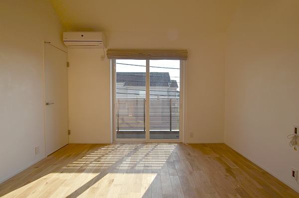 2階の主寝室です。東京で家を建てる場合、斜線制限の関係でどうしても天井下がりになる部屋が出てきます。主寝室は家具も少ないので、天井下がりの部屋の用途としては適しています。