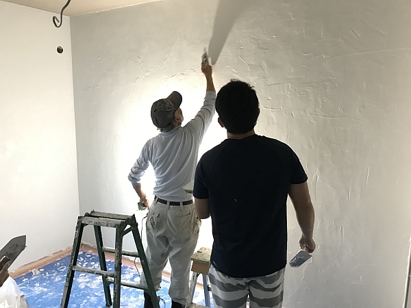 上の写真の和室と収納スペースの壁は珪藻土の塗り壁で、家づくりの記念ということで、N様ご家族がご自身で施工されました。下はその時の写真です。塗りムラを手直しする左官職人とその様子を見るご主人さまです。