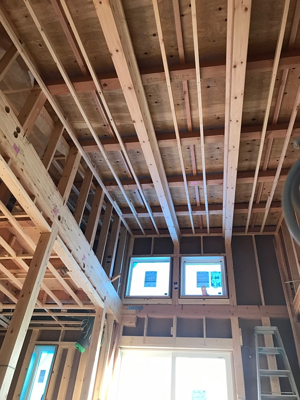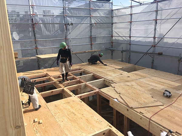 1階の天井部分が組み上がったら、次に2階部分の床材を組んでいきます。小野寺工務店では剛床工法を採用しています。