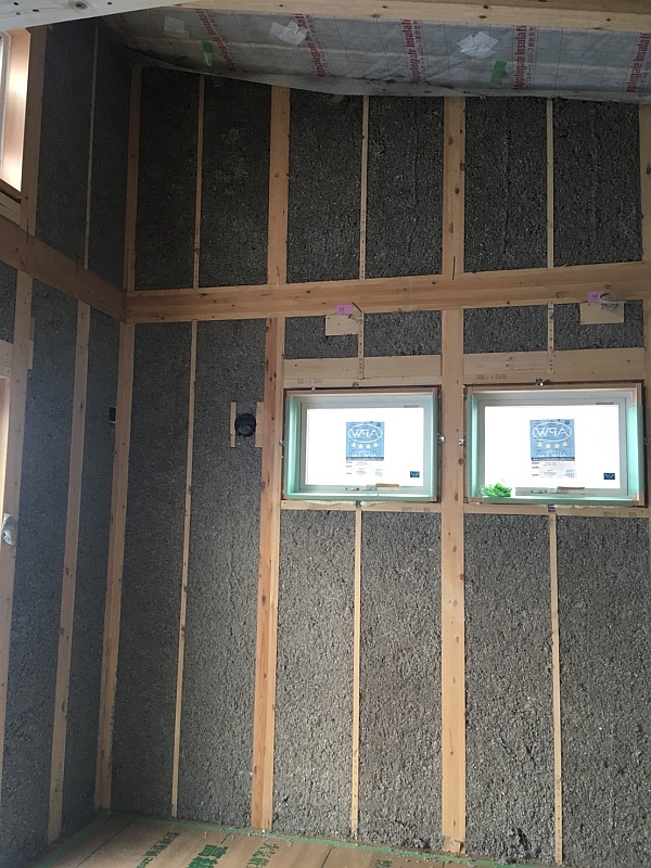 それから約1週間後の写真です。セルロースファイバーが壁に中にすき間なく充填されました。