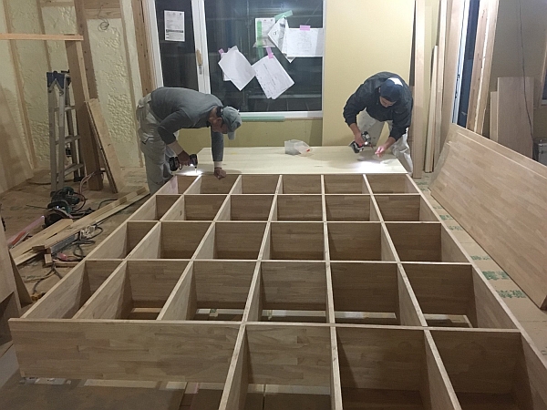 まずは屋内の大工工事から。下の写真で、大工2人が作っている巨大な木の箱、これはいったい何でしょうか?