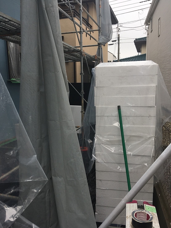 EPSボードは専用の接着剤で貼っていきます。下の写真は施工途中の写真ですが、最終的に外壁全体がすき間なくすっぽりとEPSボードで覆われます。