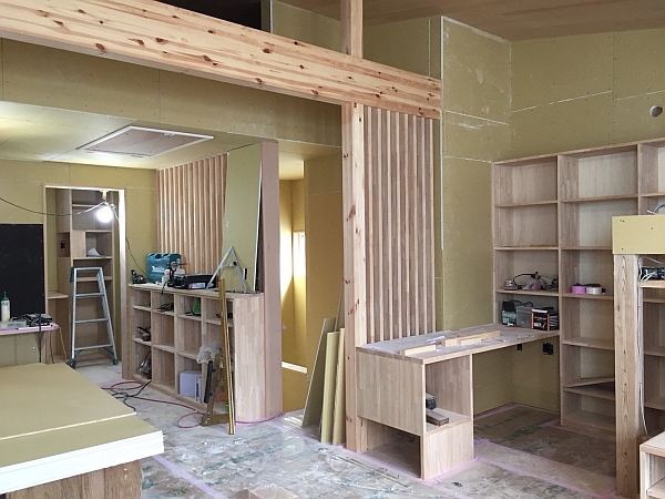 別の角度から撮影した書斎コーナーです。カウンター机も造作中です。