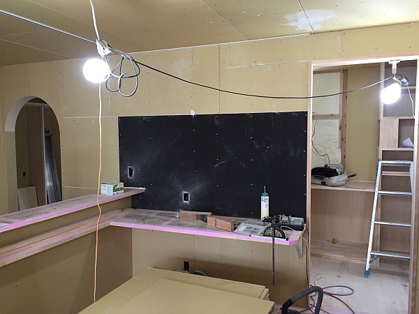 上の写真の真ん中に写っている黒い壁は黒板ではなく、FEボードという下地材です。このFEボードは表面に鉄の粉を高密度に付着させた下地材で、完成すると磁石のくっつく壁ができあがります。