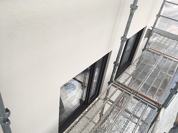 下地用塗料の上からファイバーメッシュを貼り、さらにその上から仕上げ用塗料(ガルデ)を塗れば、外壁工事の完成です。きれいに出来上がりました!