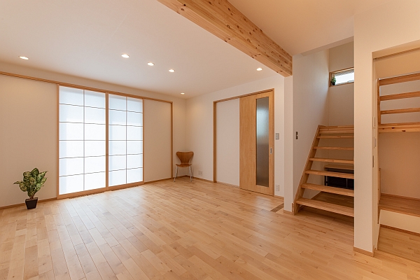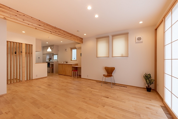 1階南側のLDKです。床はカバザクラの無垢材を使っています。右側の障子の下や正面の椅子の下の床にスリットが開いているのがわかるでしょうか?