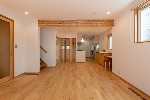 次にキッチン側から撮影したリビングです。階段の下に黒っぽい箱がありますが、これが床下エアコンの本体です。このエアコンからの暖気・冷気が床下を通って、1階の各部屋のスリットからゆっくりと出てくるしくみです。