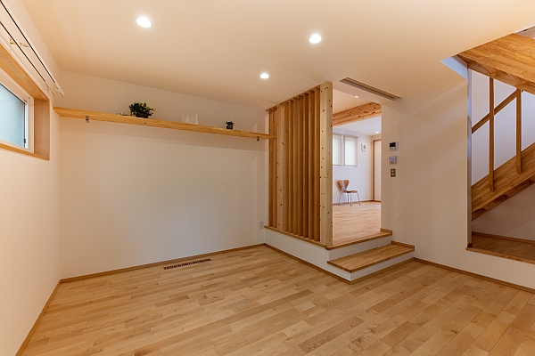 奥さまの仕事スペースの写真です。フロアレベルをLDKから階段2段分下げています。段差によって、居住スペースと仕事スペースを視覚的にゆるやかに区切っています。