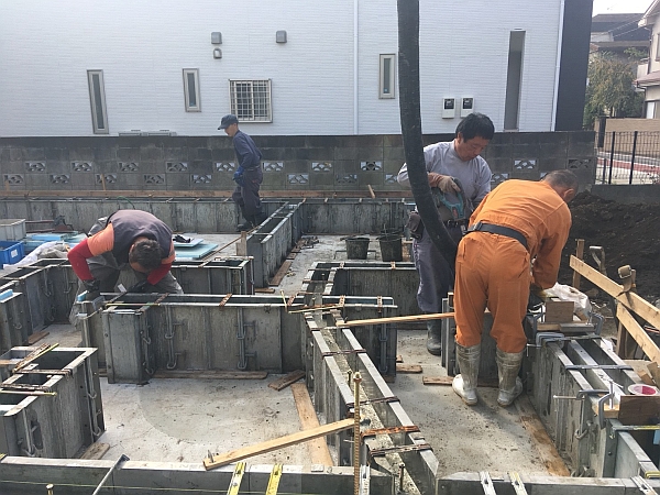 下の写真は11月中旬の基礎工事の様子です。基礎の立ち上がりの型枠の中にコンクリートを流し込んでいます。