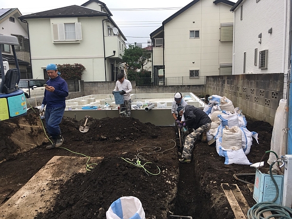 下の写真は、基礎が出来上がって外部給排水の工事をしているところです。外部給排水工事について、たまに間違った解釈をされている方がいるのですが、「外部」とは建物の外部ということで、敷地の「外部」ではありません。敷地の外部から敷地内に水道配管などを引き込む作業は「引き込み工事」と言います。