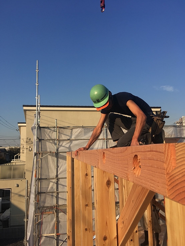 2階の天井部分まで出来上がりました。働く男の写真です。