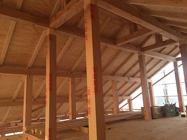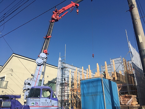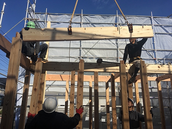 そして、迎えた上棟の日。朝から棟上げが始まります。下の写真は1階天井の梁(はり)を組んでいるところです。