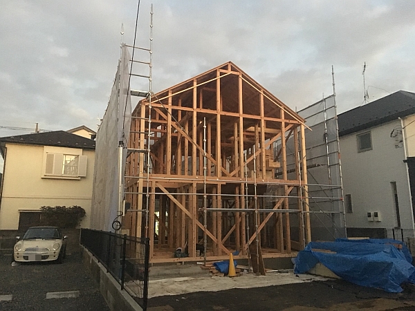 遠くからみたW様邸です。一日でここまで出来上がります。まさに棟上げです。