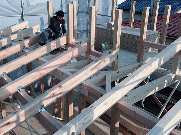 上棟から約1週間。建物内の工事も順調に進んでいます。まもなく断熱工事が始まります。