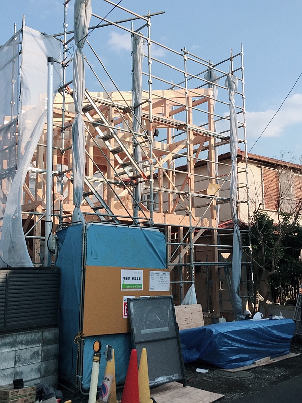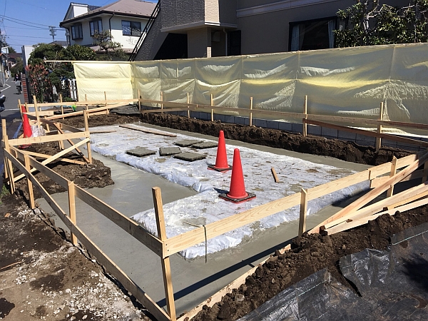 年末に駐車場の位置決めの様子をレポートしたA様邸。いよいよ工事が始まりました。横に長い27坪の台形の土地を最大限活用するために非常に複雑な形状の家を建てるのですが、耐震等級3※の住宅性能証明※を取得する予定です。