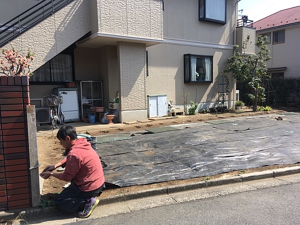 掘り下げた地面の上に、砕石を敷き込み、転圧し、その上から防湿シートを敷き込み、さらにその上から捨てコンクリートを打設したら、下の写真の状態になります。