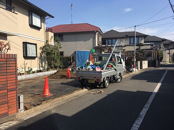 まずはA様邸の土地の形状がわかる写真を1枚。赤いパーカーを着ているのは外構の職人さんです。建物を建てた後だと、隣地境界にフェンスを施工するのが大変なので、先にフェンスの土台だけ作っておくのです。