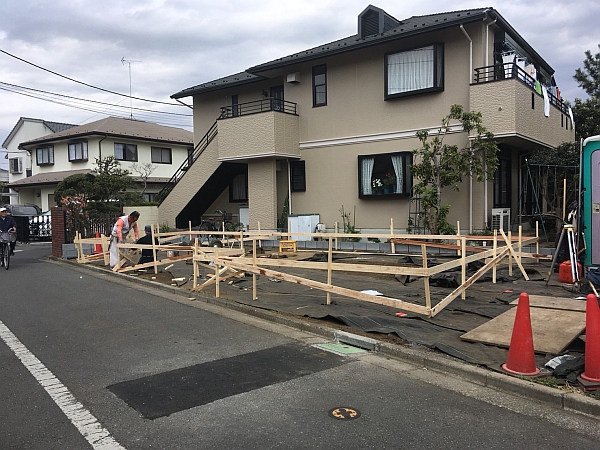 フェンスの土台ができ上がったら、いよいよ基礎工事が始まります。下の写真は、基礎工事に先立って、遣り方(やりかた)をかけている基礎工事の職人さんです。この遣り方が建物の基礎の高さの基準になるので、実はものすごく重要な作業です。