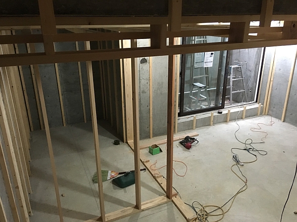 地下室はこんな具合です。間仕切りの壁や天井を作りつつあります。
