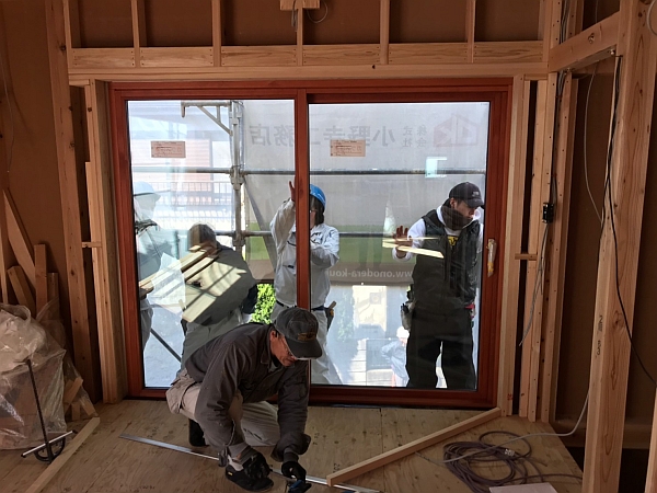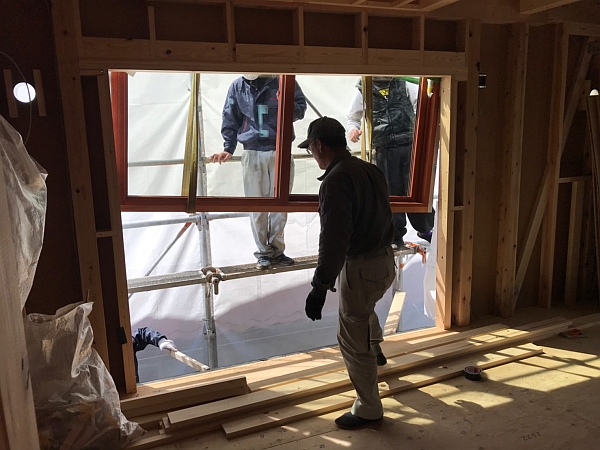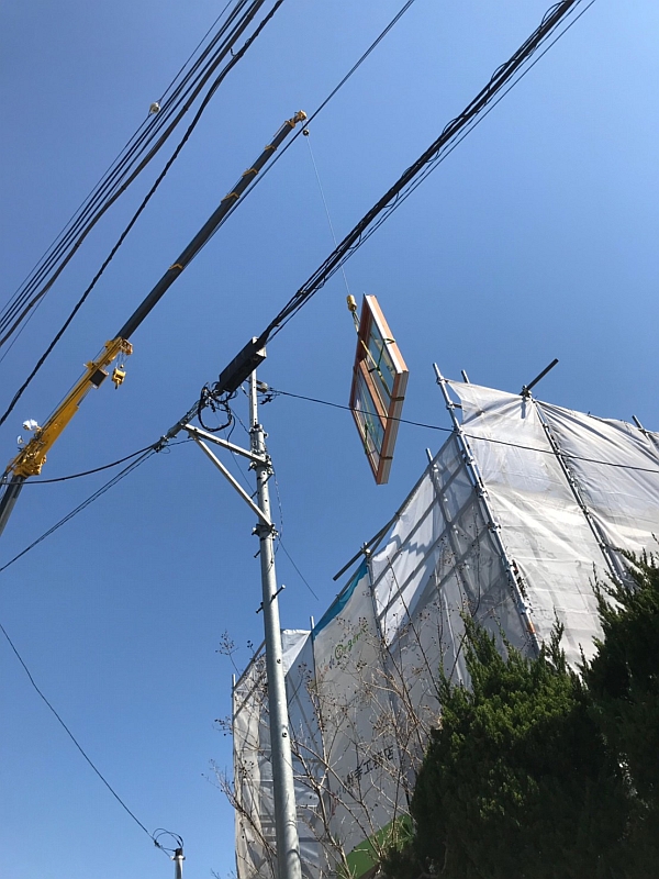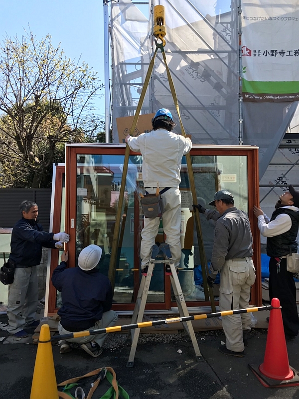 T様邸のデザイン上の大きな特徴の1つ。巨大木製サッシの搬入と設置も無事に終わりました。以下の連続写真は、巨大木製サッシの搬入から設置までです。
