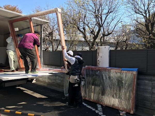 搬入されてきた木製サッシ、製品名は「夢まど」と言います。170kgあるので、トラックから降ろすだけでも大変です。