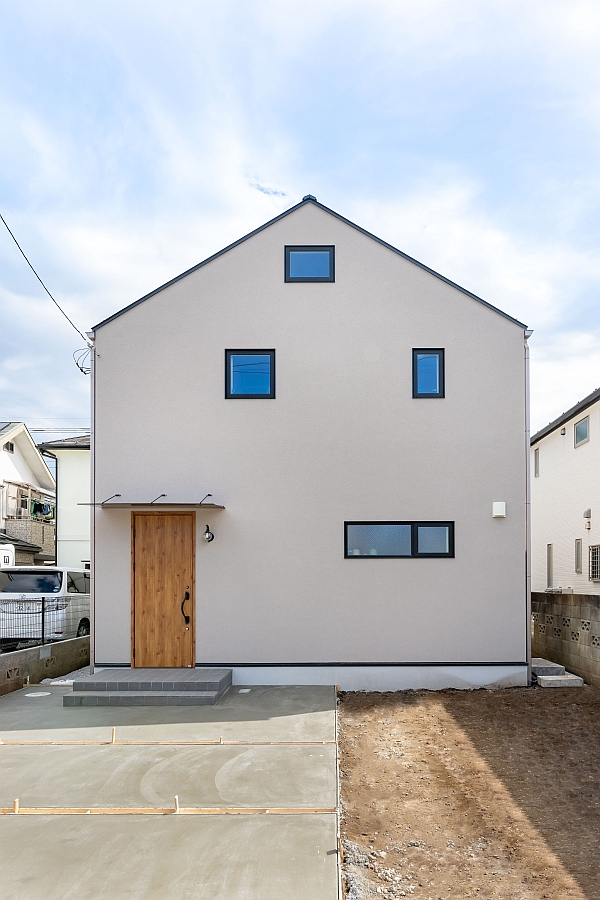 まずはかわいらしい外観から。おとぎ話に出てくるような切妻(きりづま)屋根のおうちです。正面からのシンメトリックな形にこだわりました。外壁はジョリパットの吹き付け仕上げです。