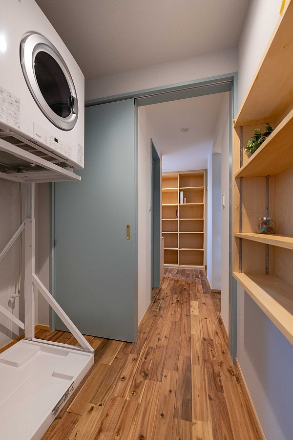 バスルームを背にして、脱衣室とその向こうのファミリークローゼットを撮影した写真です。手前の機械はガス乾燥機です。これも小野寺工務店のおすすめ定番設備で、洗濯機の乾燥機能に比べて、強烈に乾きます。