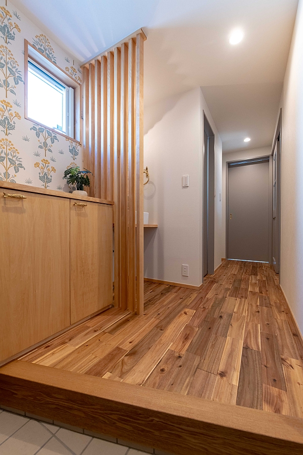 ぐるりと振り返って、玄関から家の中を見たところです。階段下のスペースを利用して、約2帖の納戸を設置しました。