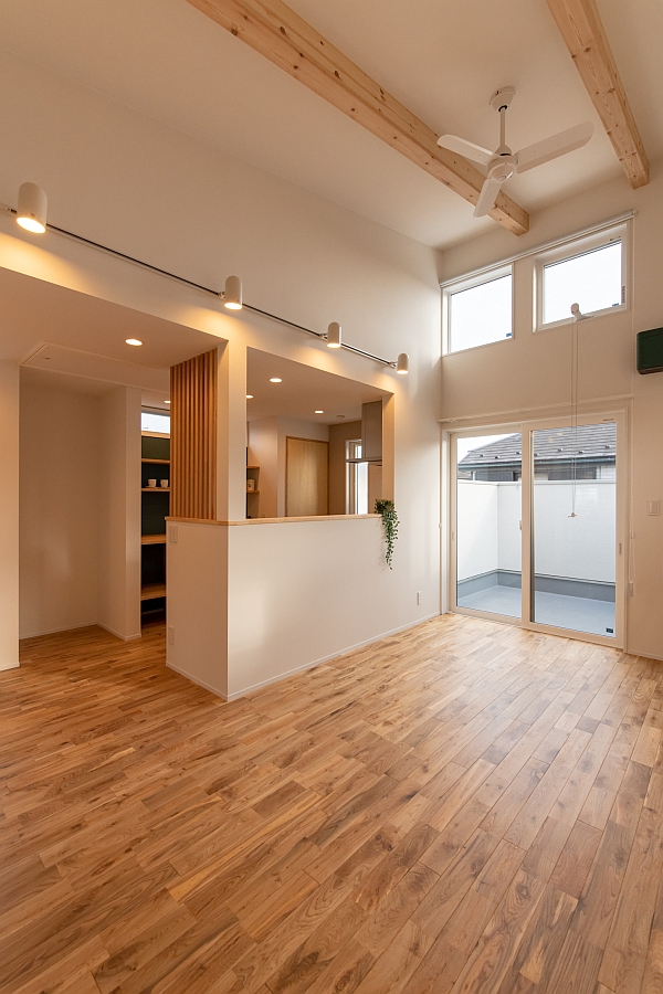 建築家が「光の煙突」と表現したリビングの南側に設計した吹き抜けです。W様邸のリビングは南側に窓を取っていますが、西道路の敷地のため、南側には隣家が迫っています。「光の煙突」のおかげで、隣家の視線が気にならない、明るいリビングになっています。