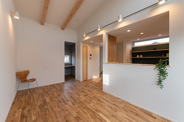 K様邸の一番の特徴の「登り梁(のぼりばり)」のあるリビングです。勾配天井に沿って、梁が斜めにかかっているのがよくわかると思います。床材はオークの無垢材です。