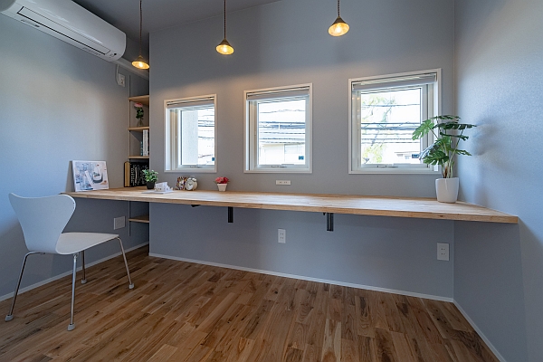 本を読んだり、パソコンで仕事したりできるワークスペースです。カウンターは造作しています。壁の色は写真では紫っぽく見えますが、実際の色は薄いグレーです。