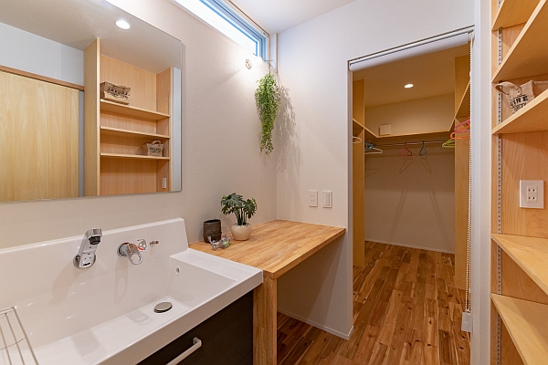 1階に降りていきます。ふたたび作業台のある洗面スペースです。奥に家族全員の衣類を収納できるファミリークローゼットを作りました。